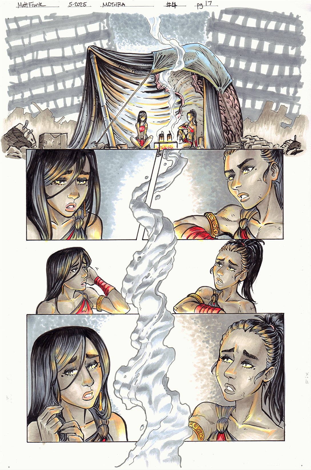 We are thrilled to offer 20 original comic book pages from Mothra: Queen of the Monsters Issue #3 โ the first-ever solo comic series starring Mothra herself, brought to life by artist Matt Frank and written by Sophie Campbell with physical colors by Roberto Rivera Padro and Matt Frank!