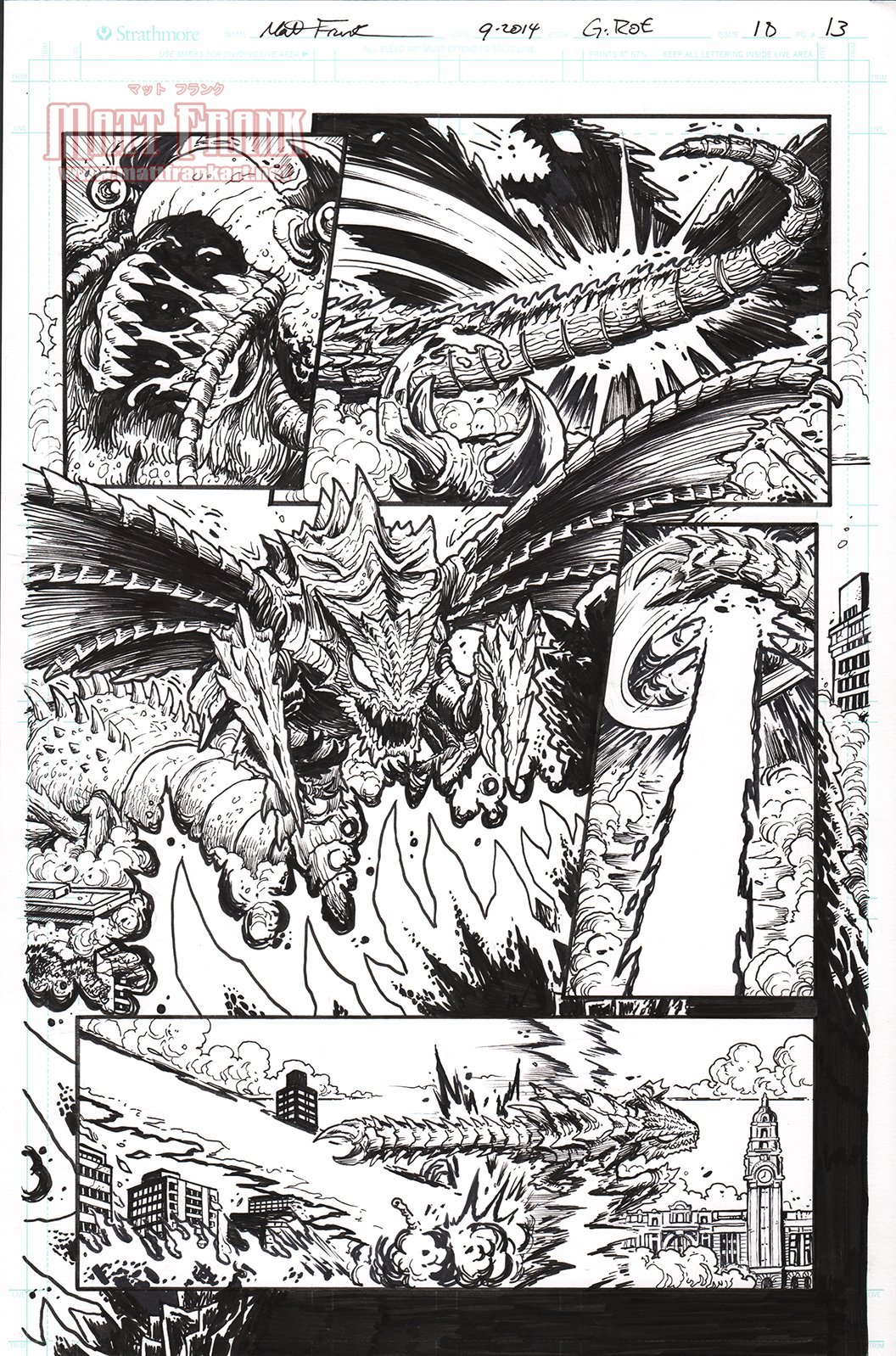Own a piece of history! Dive into the heart-pounding world of Godzilla like never before with the opportunity to claim the ultimate prize: the original inked page from the electrifying "Godzilla: Rulers of Earth" from issue #18, page #13!