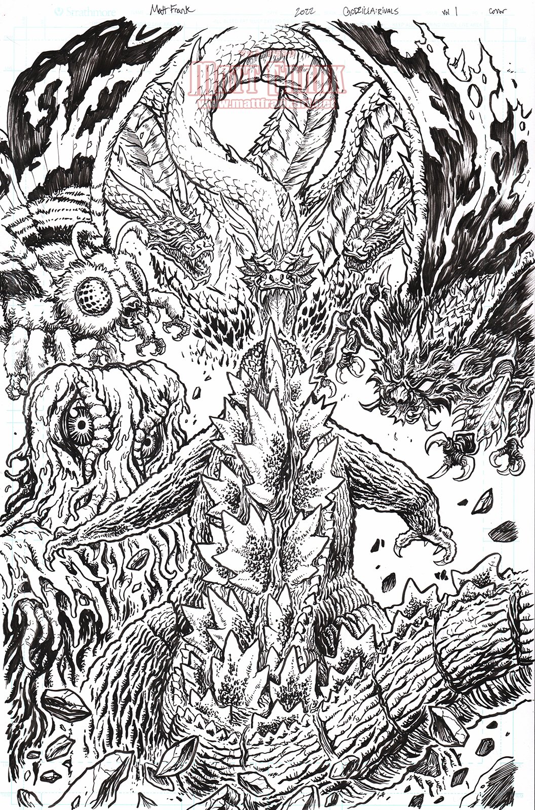 The is the original inked cover for "Godzilla Rivals" volume #1 Round One Godzilla Store-exclusive cover by Matt Frank.