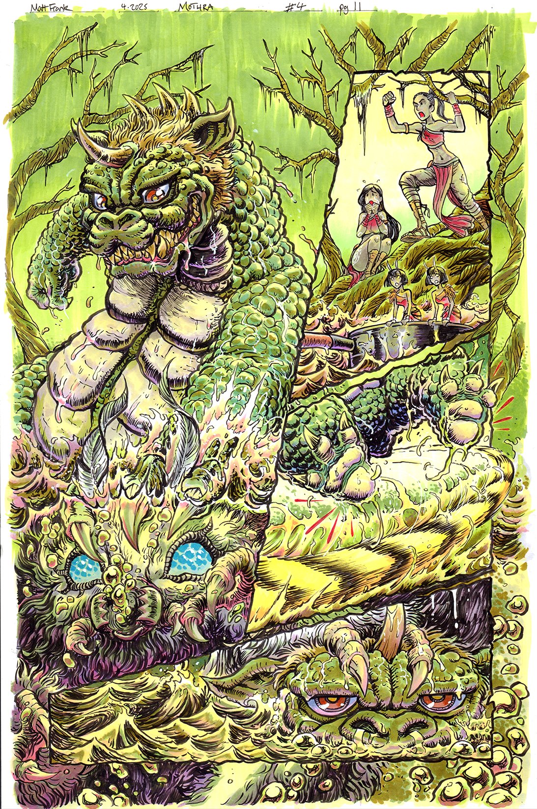 We are thrilled to offer 20 original comic book pages from Mothra: Queen of the Monsters Issue #3 โ the first-ever solo comic series starring Mothra herself, brought to life by artist Matt Frank and written by Sophie Campbell with physical colors by Roberto Rivera Padro and Matt Frank!