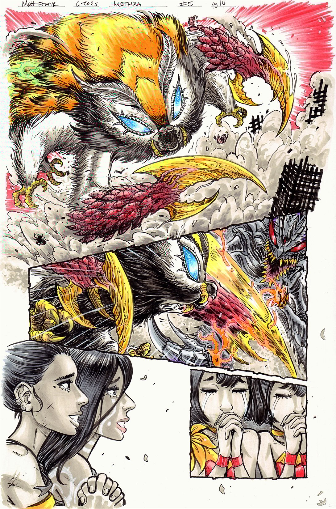 We are thrilled to offer 20 original comic book pages from Mothra: Queen of the Monsters Issue #5 โ the first-ever solo comic series starring Mothra herself, brought to life by artist Matt Frank and written by Sophie Campbell with physical colors by Roberto Rivera Padro and Matt Frank!