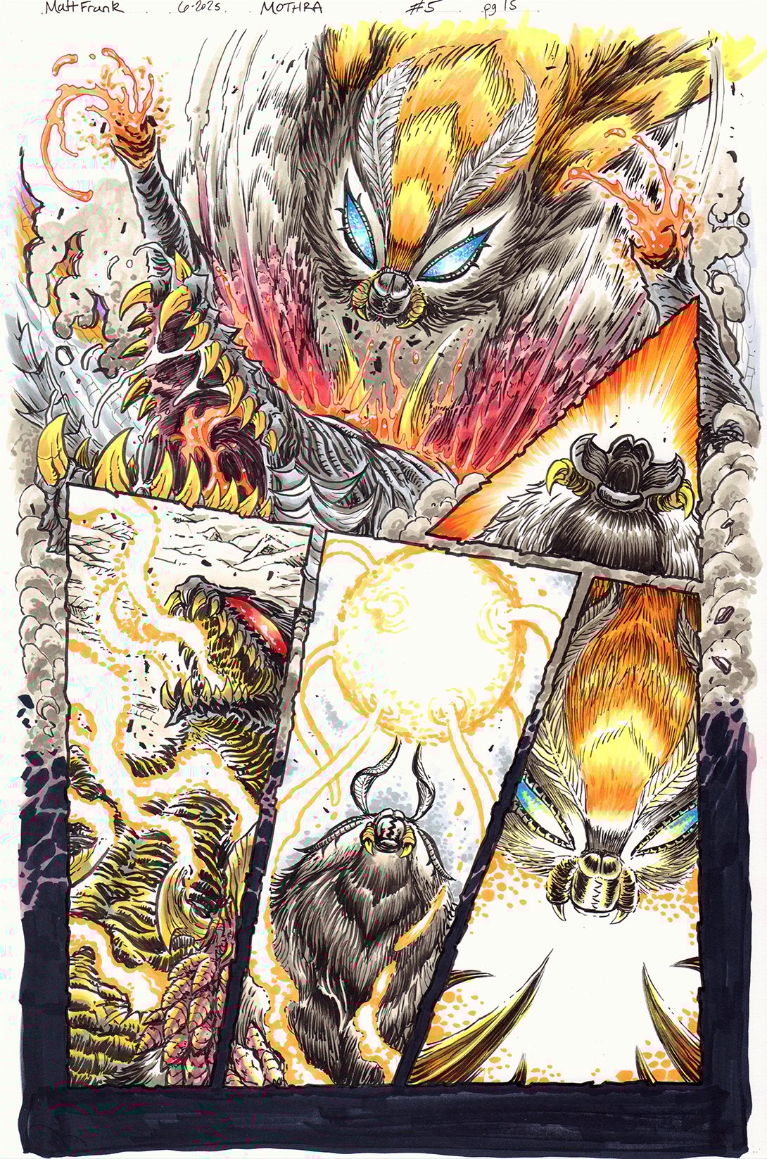 We are thrilled to offer 20 original comic book pages from Mothra: Queen of the Monsters Issue #5 โ the first-ever solo comic series starring Mothra herself, brought to life by artist Matt Frank and written by Sophie Campbell with physical colors by Roberto Rivera Padro and Matt Frank!