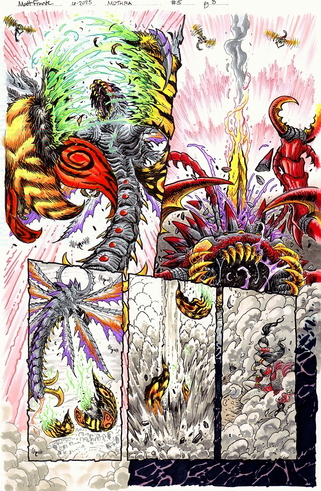 We are thrilled to offer 20 original comic book pages from Mothra: Queen of the Monsters Issue #5 โ the first-ever solo comic series starring Mothra herself, brought to life by artist Matt Frank and written by Sophie Campbell with physical colors by Roberto Rivera Padro and Matt Frank!
