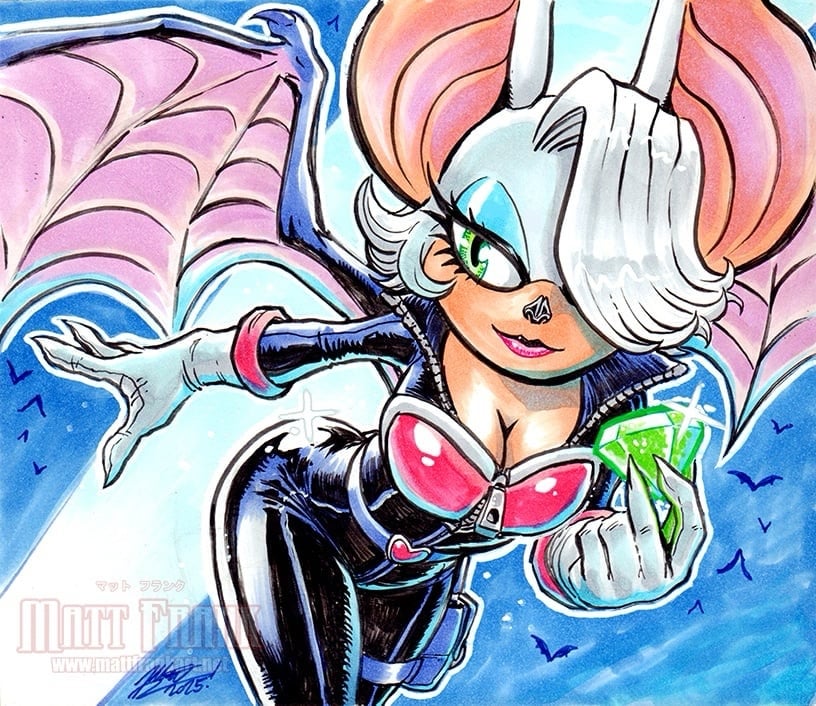 Original artwork of Rouge, drawn and colored on Japanese shikishi board with gold trim, using pencils, Japanese pen-and-ink, Copic markers, and paint pens.